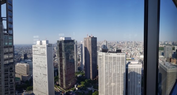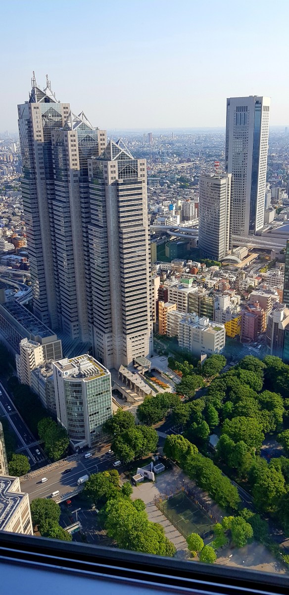 A visit to the Meiji Jingu – a lovely large park – very bushy with Torii Gates and temples then off to the Tokyo Metropolitan Government Building – 45 floors in 54 seconds and we are getting a panoramic view of the city. Just a short 15 minute queue.