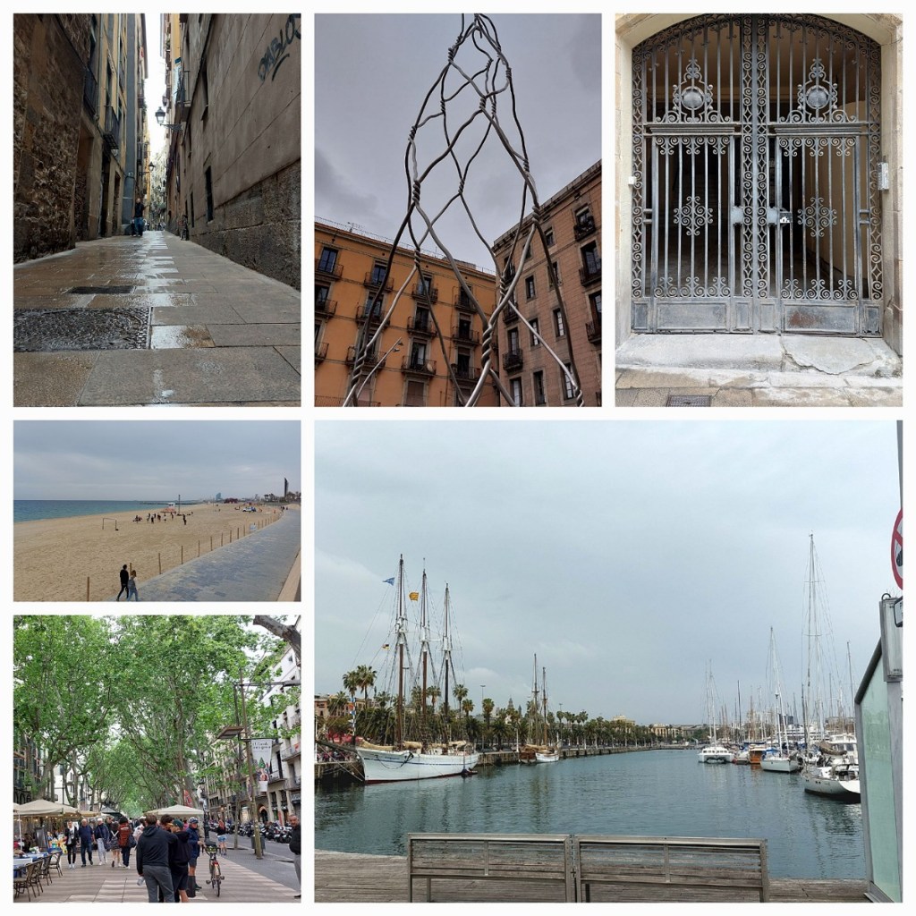 We headed along the river and the coast to the city centre some 10km away. A bit of a light mist at times. Trying to find the tourist information office was difficult only for it to be closed until further notice. So here we are blindly trying to find tourist things to see. At least we are booked on a city bike tour tomorrow. We stumbled into the Gothic area with narrow streets at all angles and hidden plazas. Very quaint. A bakery Cafe in the Gothic area for lunch. Further on we came to La Rambla … now we see where the tourists hang out, we walk our bikes as we don’t see bikes or scooters around.