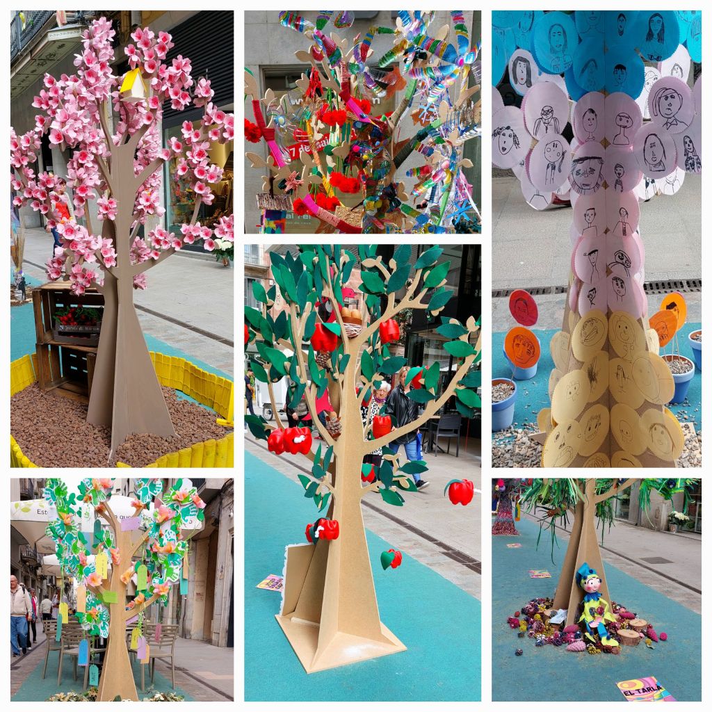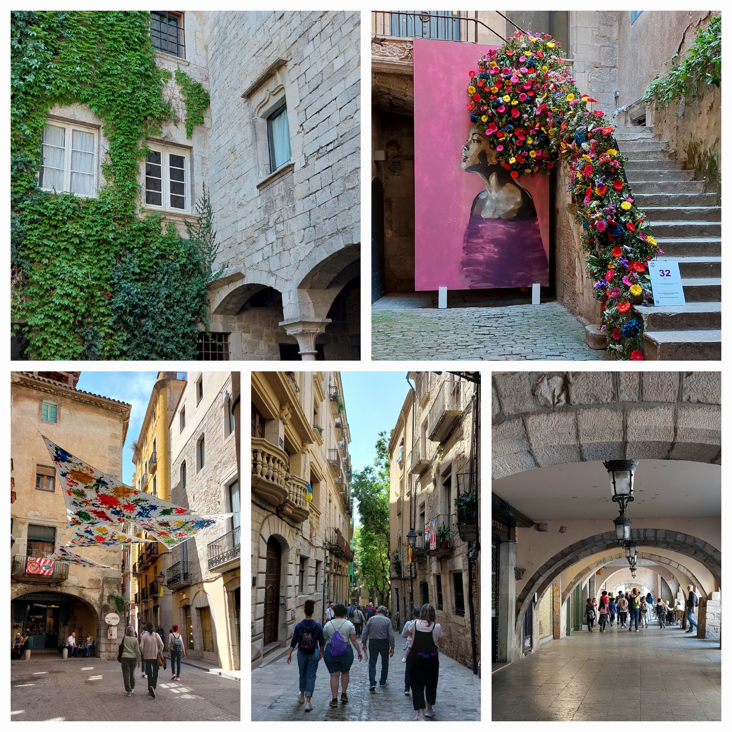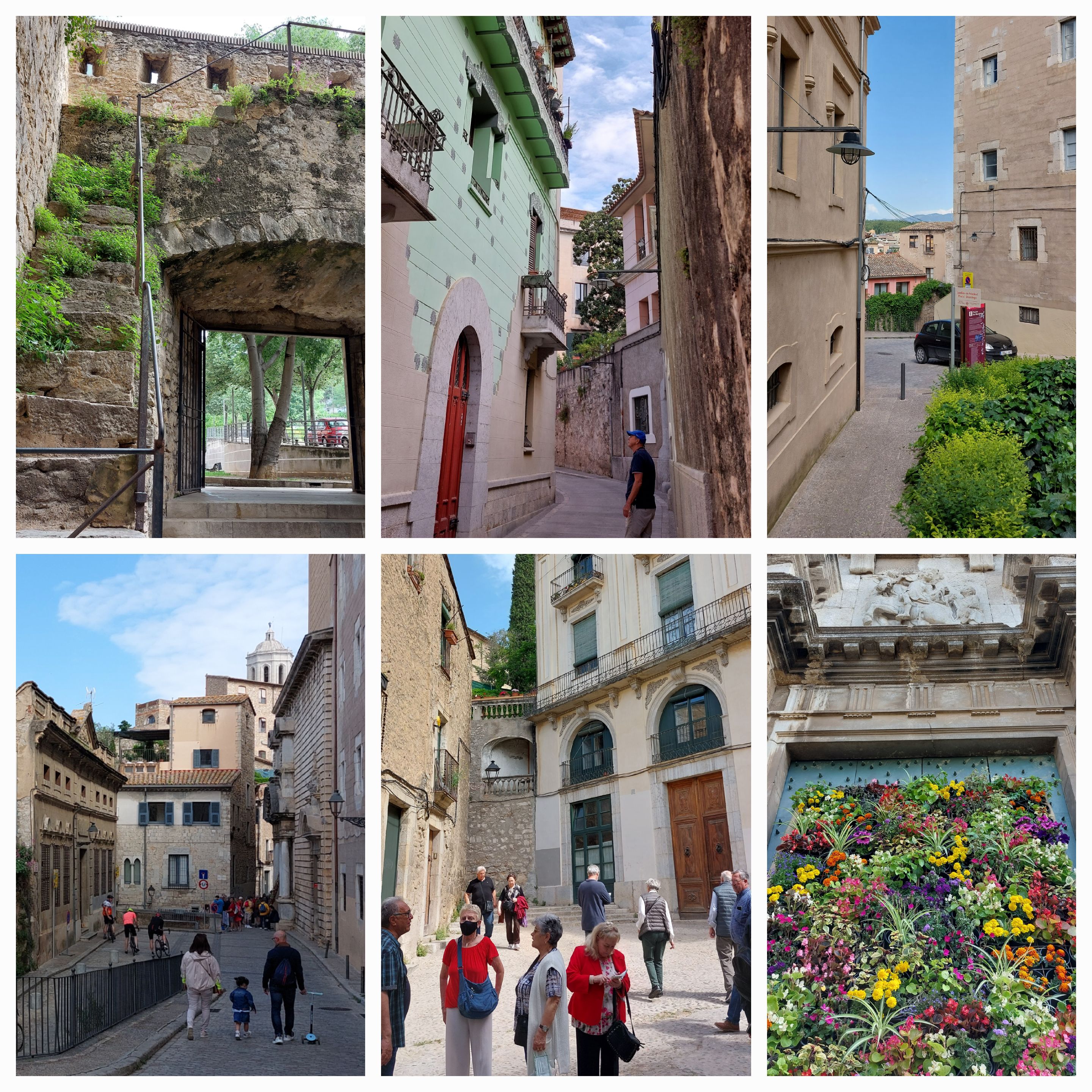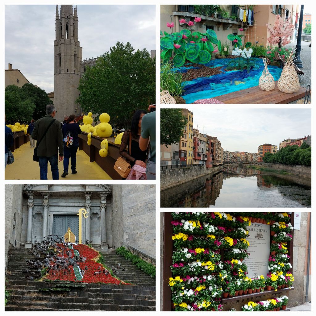 We recognise some of the flower displays from our hectic entrance yesterday no crowd at the moment. We cross the river again at another bridge and see an array of flower exhibitions in the Placa de la Independencia, on of Girona’s most popular squares featuring many restaurants, the flowers are amazing like all the exhibitions in the city during this Flower Festival. A small cafe attracts John’s eye and we settle for coffee and pastries.