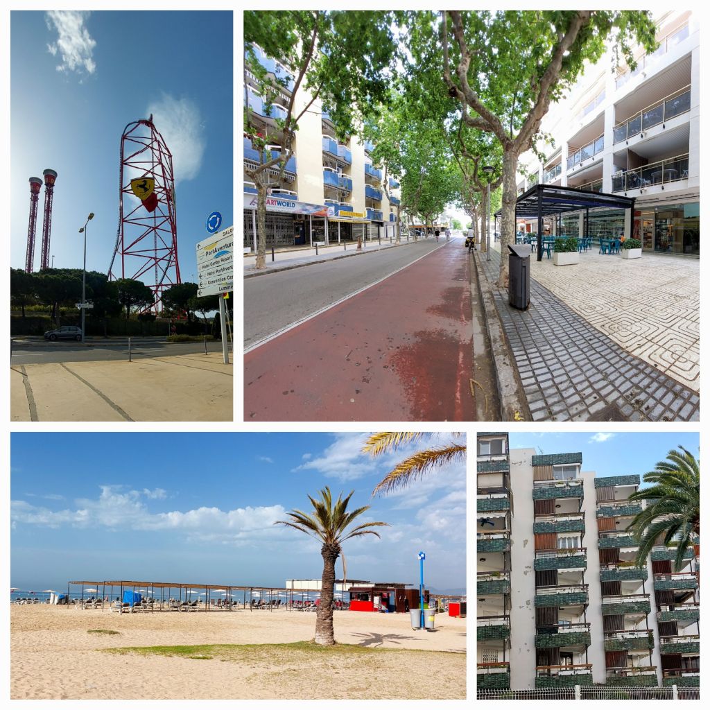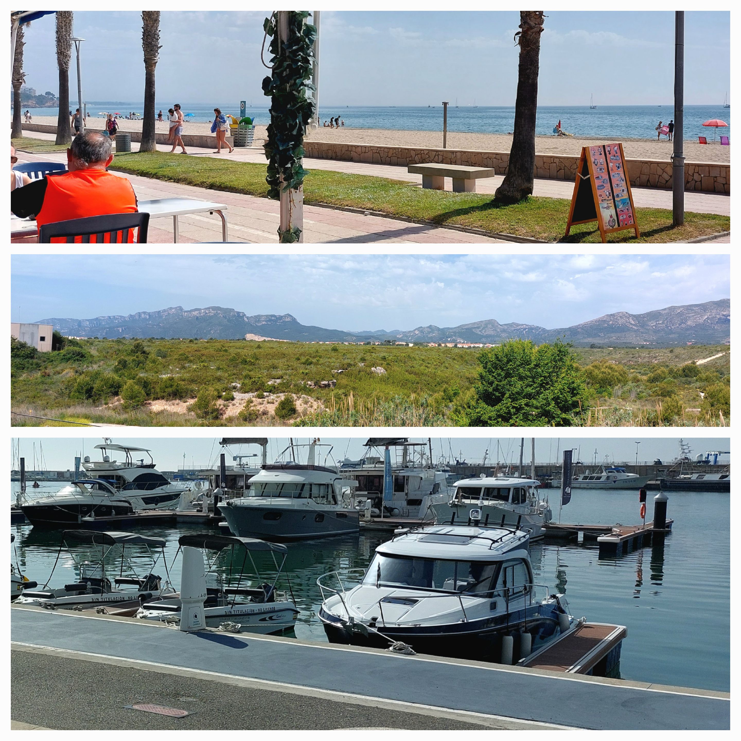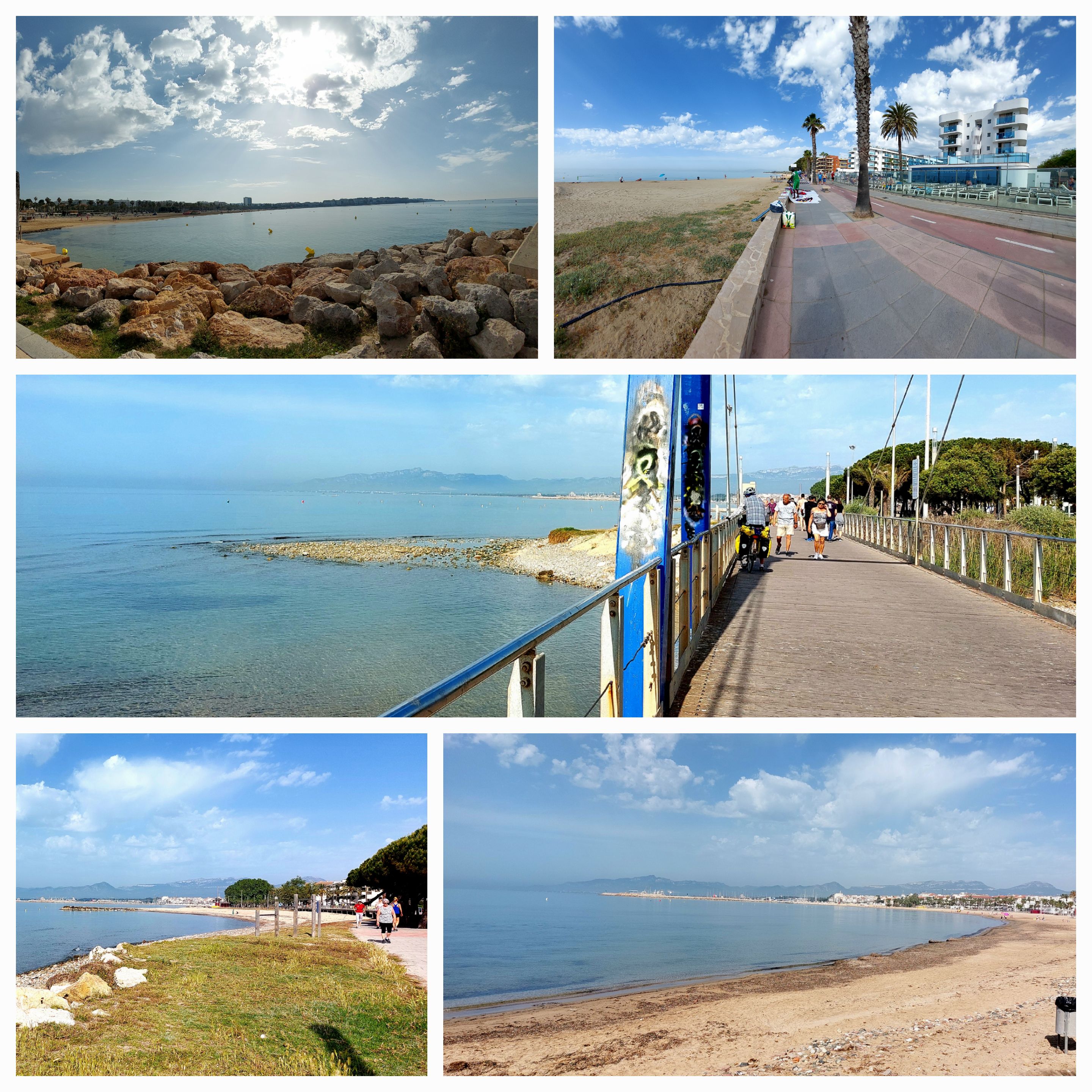 The promenade is wide and the beaches have a scattering of beach goers baking in the morning sun. There are lots of street sellers with fully laden trolleys vying for their spot to set up their pavement stalls. From handbags, shoes, beach umbrellas to hairbraiding. We are lucky today it is early enough to avoid too many people … mainly joggers and walkers keeping to the walking path. We, on the other hand have a dedicated cycle path along side. We stop to get some air for my very very slow leak 0.50€ per tyre … tomorrow I won’t forget to check. John says it keeps getting better as we near to the mountains in the background.
