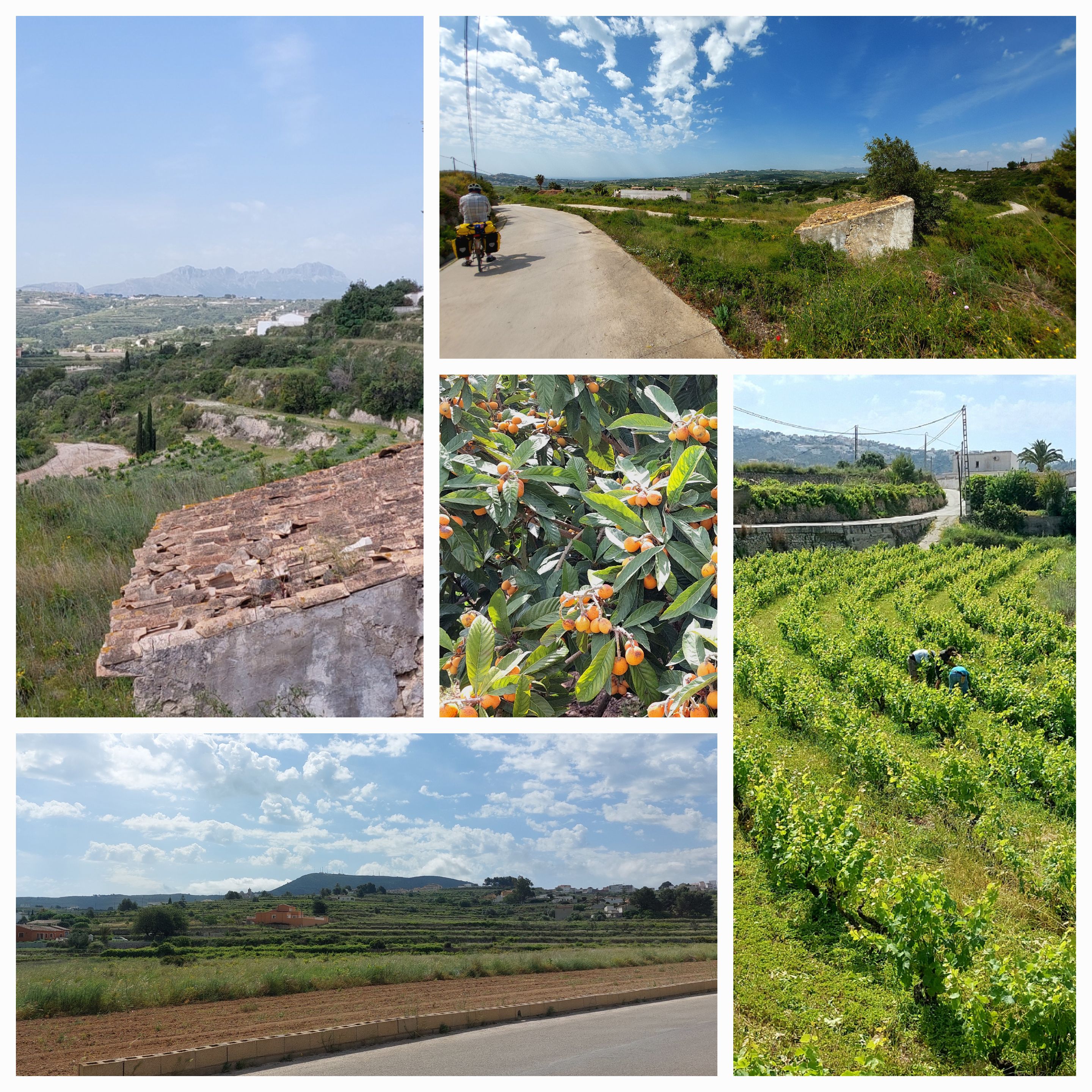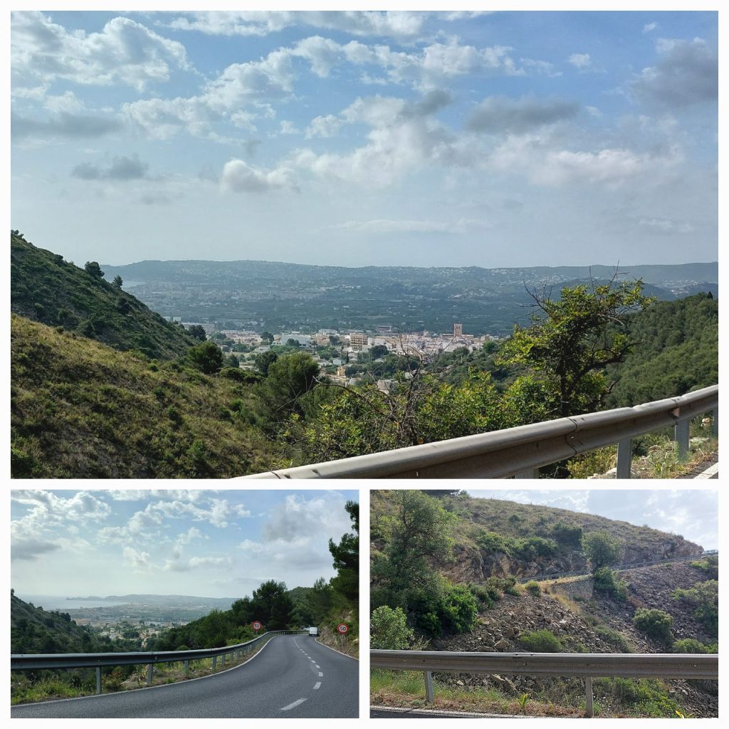 Starting off through the Old Town of Denia, it is way bigger than I thought. Within 3km we are climbing up the suburban hills with lovely houses. Too far from the beach says John. In no time time we are into our first climb for the day … climbing up the mountain. We have been following these mountains for days and it’s now our turn to venture on the other side. There is a lot of low cloud which keeps the temperature down although it is humid. We climb around the mountain catching some great views, the traffic is very forgiving as cars are held up intermittently behind us. I don’t think anyone will be late for work on our account. Not many opportunities for pics with the blind corners of the road! 2.5km seems like 5km …