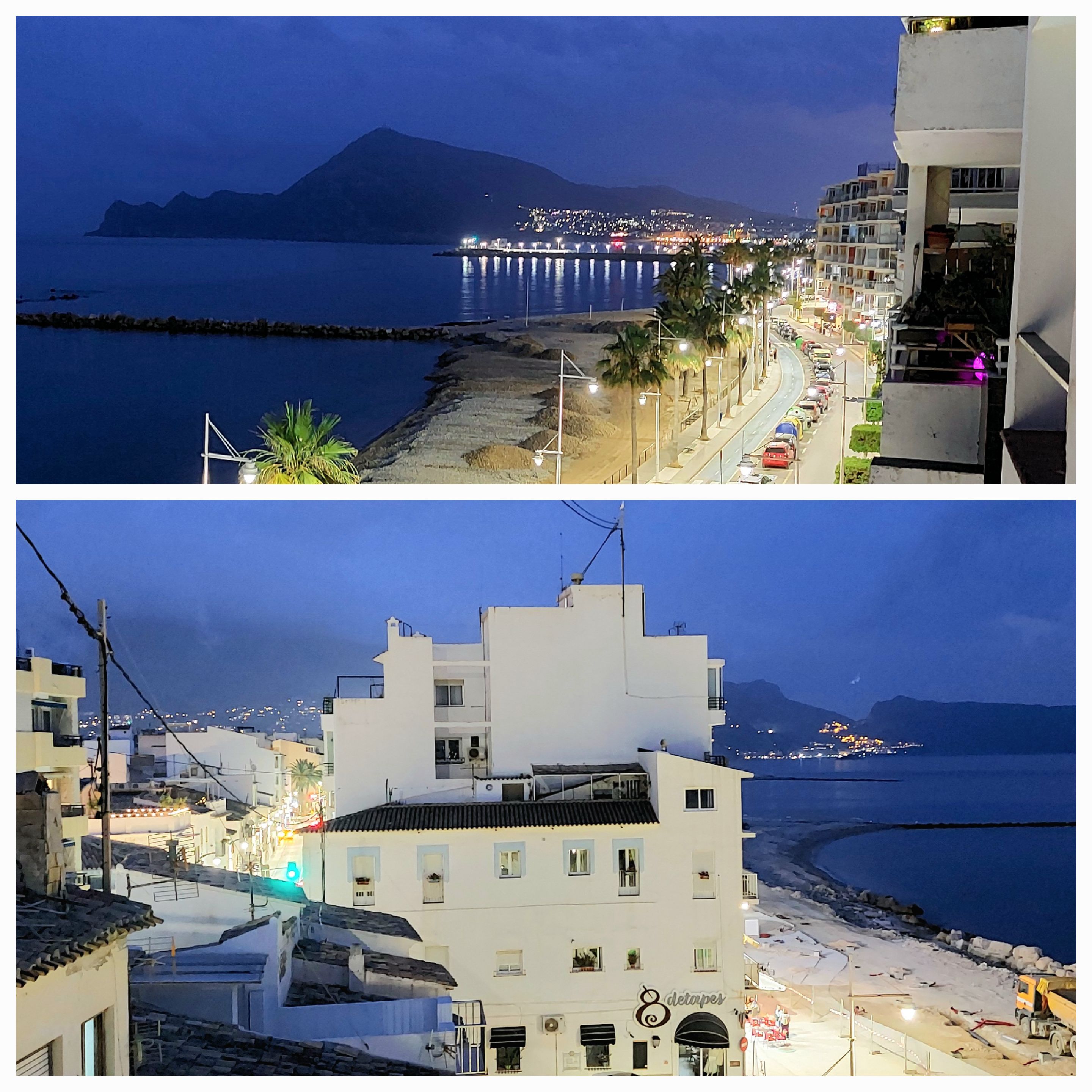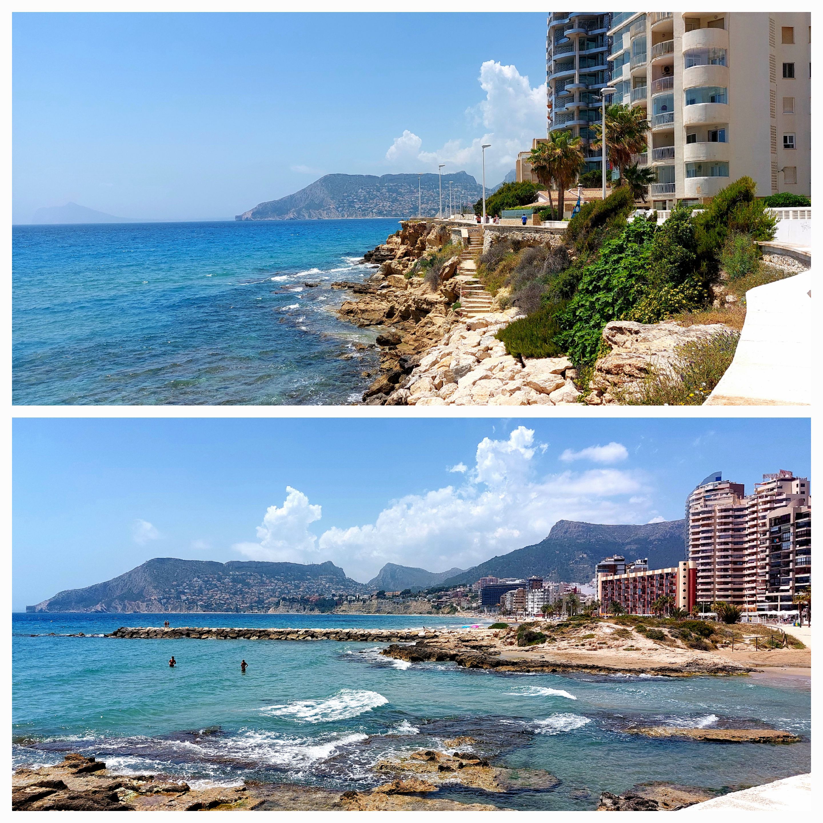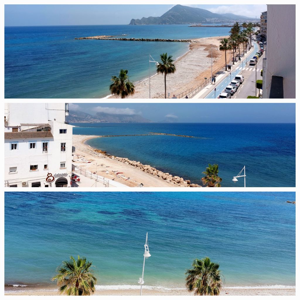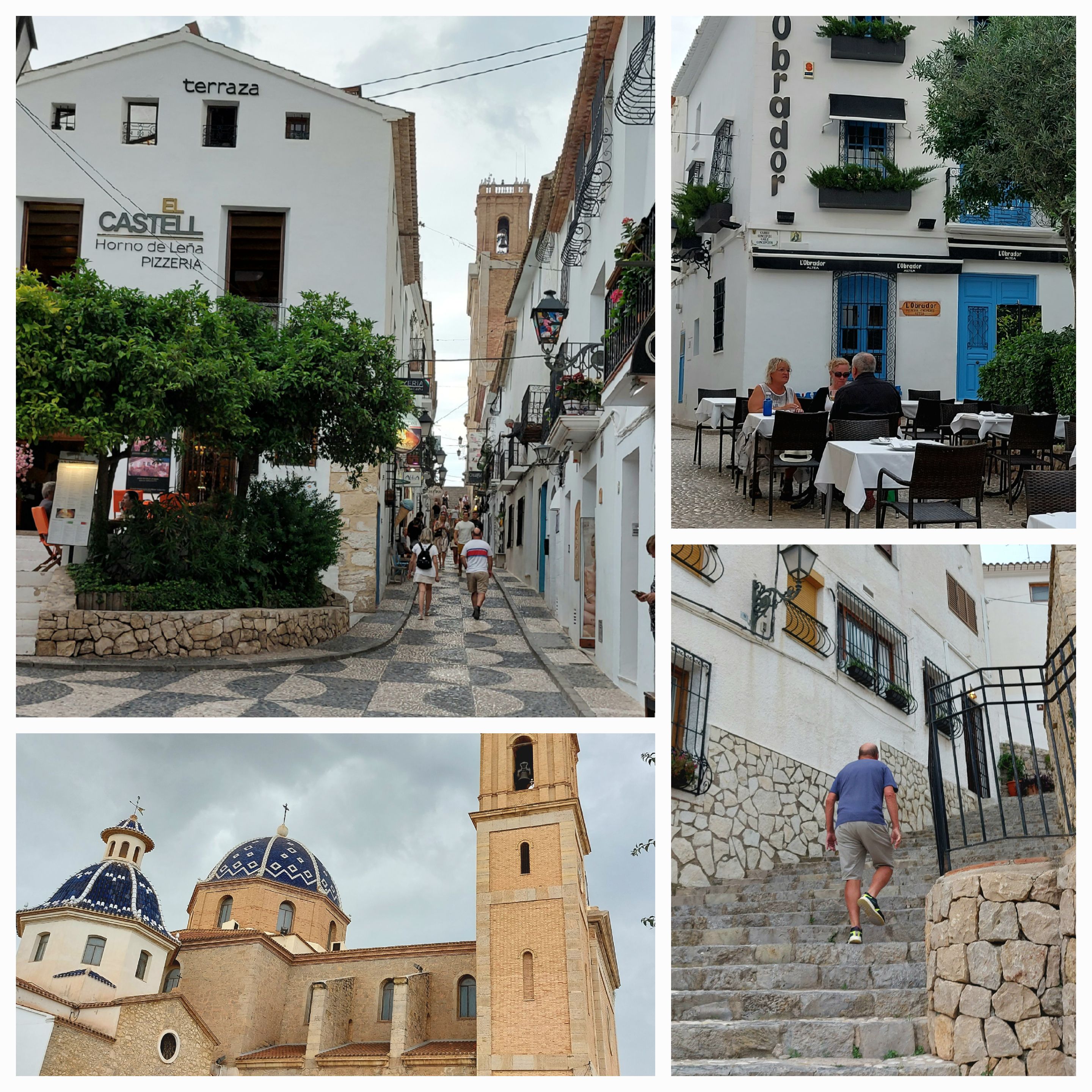 We then decend to a lovely very salubrious town of Calpe featuring giant rock formations dripping into the sea. Very Ritzy apartment buildings then we are climbing our last hill … 11km to Altea … with tired legs … there is a God … a series of short tunnels cutting through the rocks …. then the downhill began with great views and down into Altea.