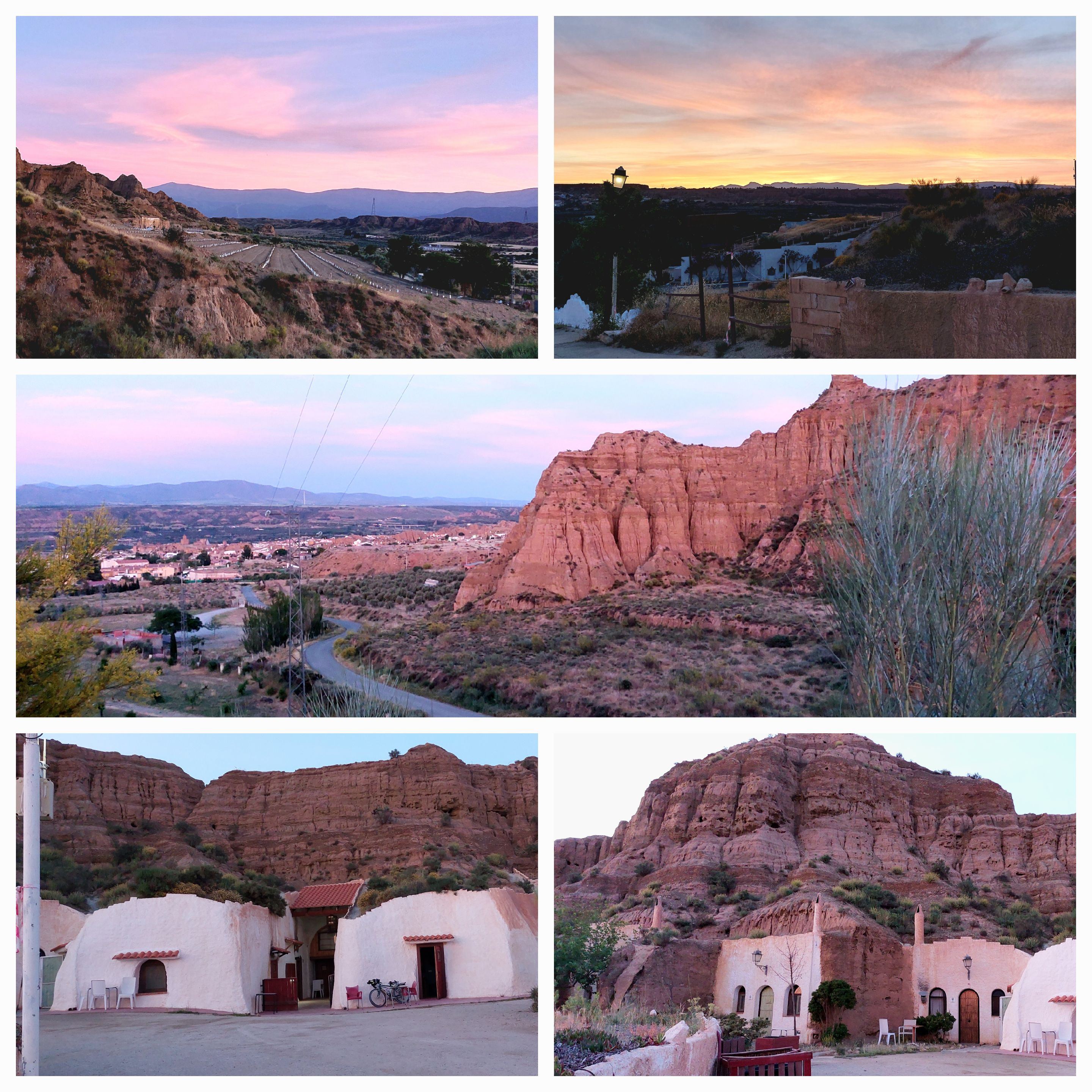 We have come to the end of the ascent and looking to the next 25km of downhill. We come ‘off course’ as garmin gets tired and wants to go to sleep. All’s good we see some paths that should take us in the general direction to Guadix … road signs on highway verify. I can see we are off course but not far away as we go along dirt roads then double back. Another attempt on another road … double back again … perhaps the other side of the highway … double back … back on the other side different path … dead end at phone towers. Our course is near as we look below over the rugged mountains that we have climbed to a spaghetti of roads and highways … Guadix not far in the distance.