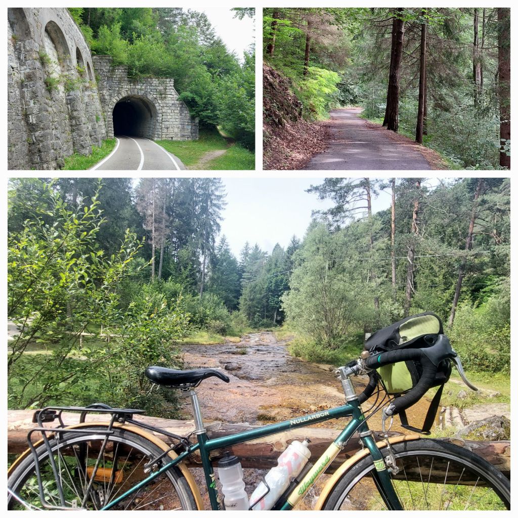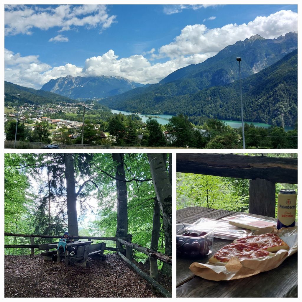 Back on the track to the next little village, a bit rough as we wheel our bikes, a local supermarket for lunch items and a cute wooden table and chairs hidden amongst the old fir trees with glimpses of the lake. This is too relaxed on the ‘smelling the roses tour’