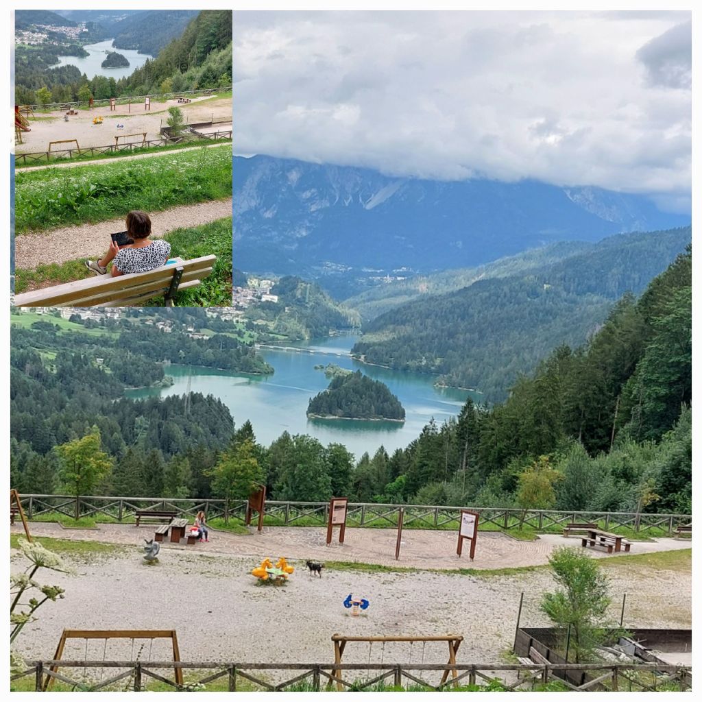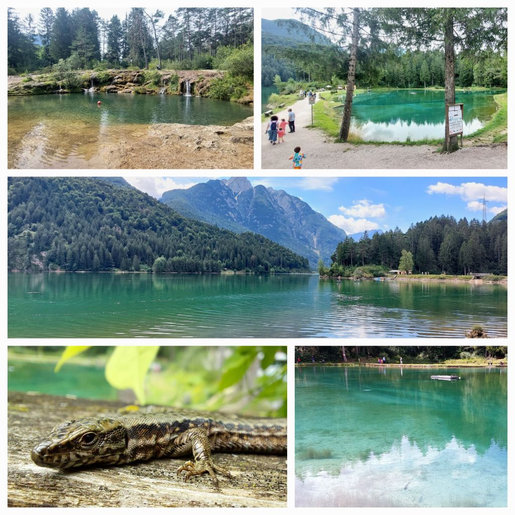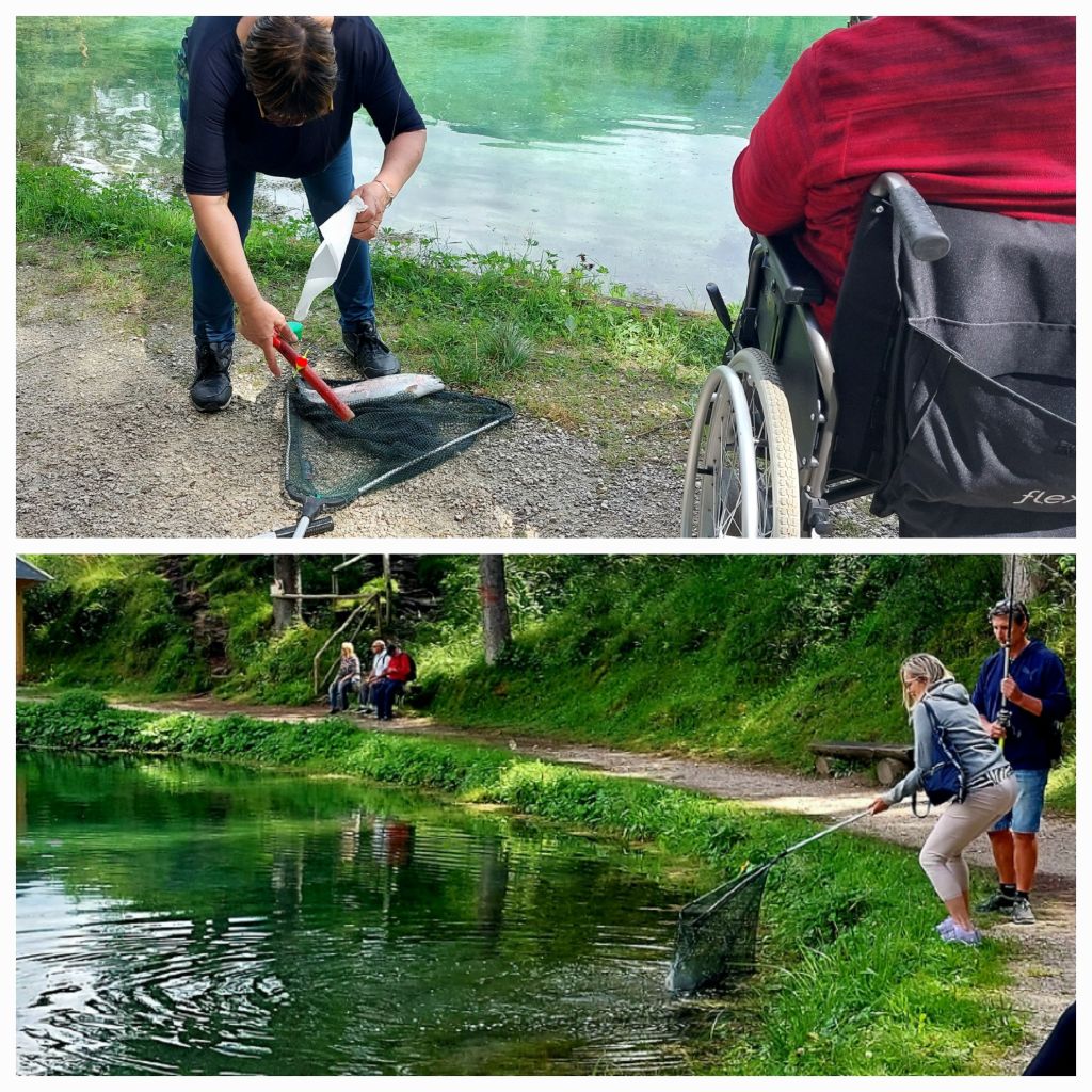 Further on, the lakeside has a bustling Cafe. It’s a local spot for hiking; a small pond with a pontoon; today trout fishing seems to be the attraction for families. Crystal clear waters running off from the mountains, rainbow trout being caught. A manager/owner keeping a close eye on the catches, he weighs and charges €11 per kilo.