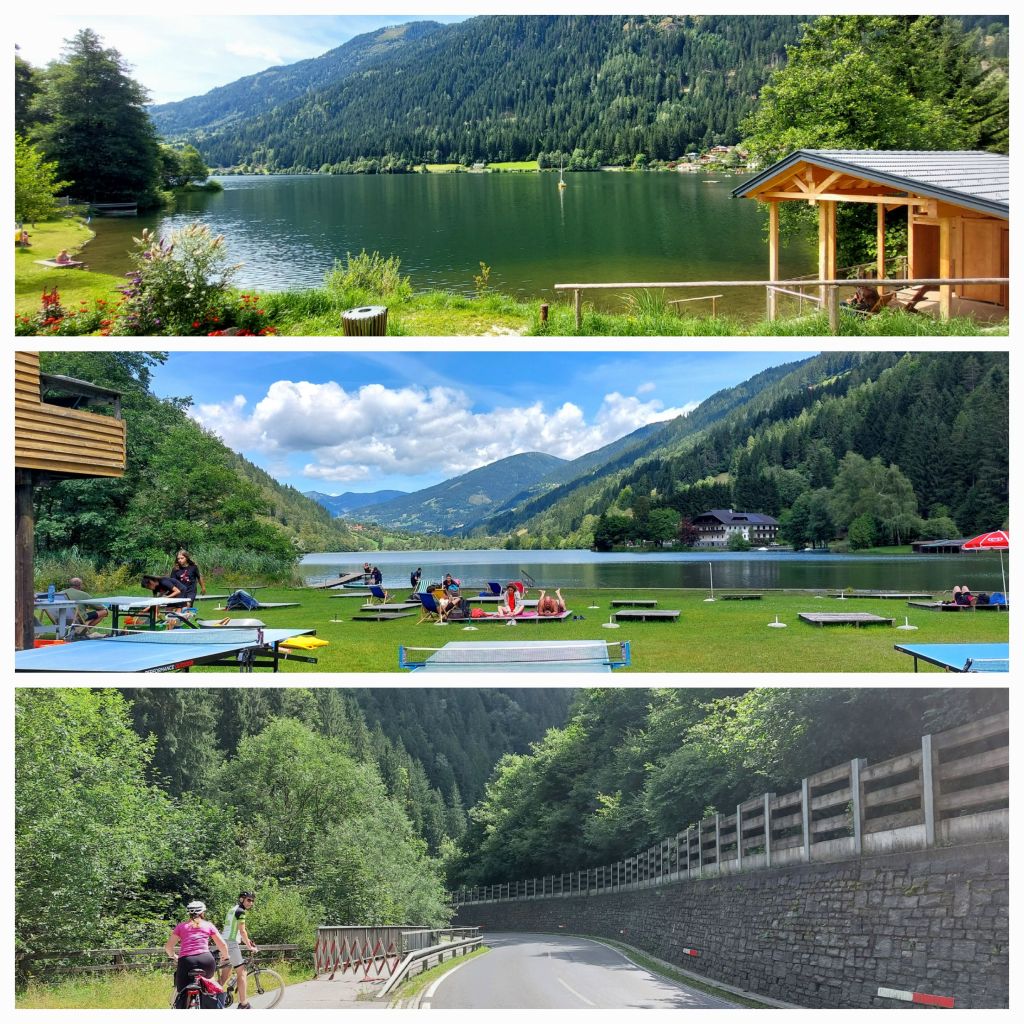 A short 3km flat ride travelling by the river rapids to Millstatter See, a great ride on the north side of the lake, very picturesque, a lovely lake with little villages full of holiday accommodation and many camping parks. As in all Austria, lovely manicured lawns and gardens. The climb was easy to Radenthein through the valley, passing by two smaller ĺakes; Feldsee and Afritzer See.
