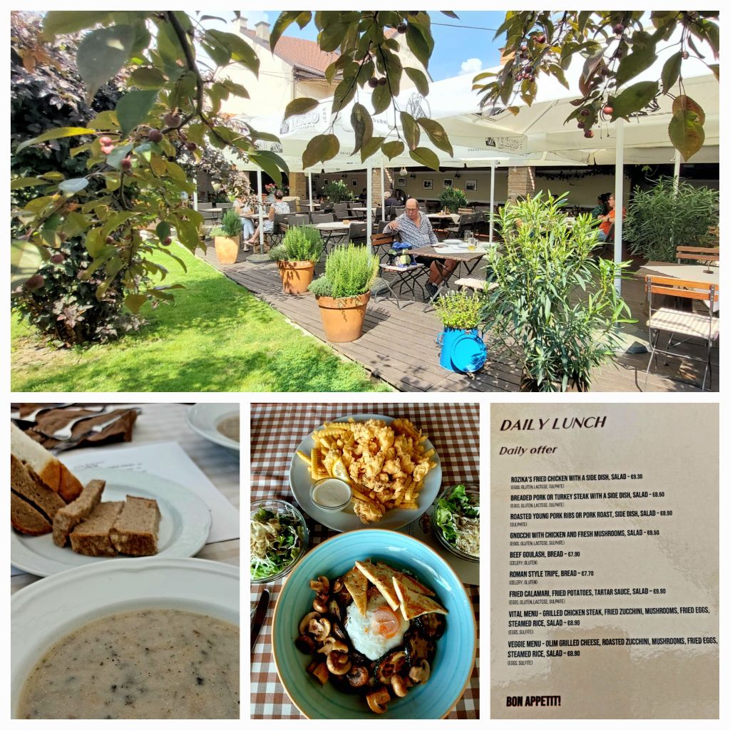 Breakfast … John is after a toastie … we asked at a cafe and the lady suggested a restaurant ‘the best food in town’, well, just a door that we would not have thought of entering … up some stairs and into the restaurant proper with a garden. It’s around 10.45am, people are tucking into big meals and beers and wine. Well! says John, we’ll be just like the locals … calamari, chips and salad for him; roasted vegetables cheese for me with salad. Beer and wine … brunch! And also complimentary mushroom and potato soup. All for ā¬28.