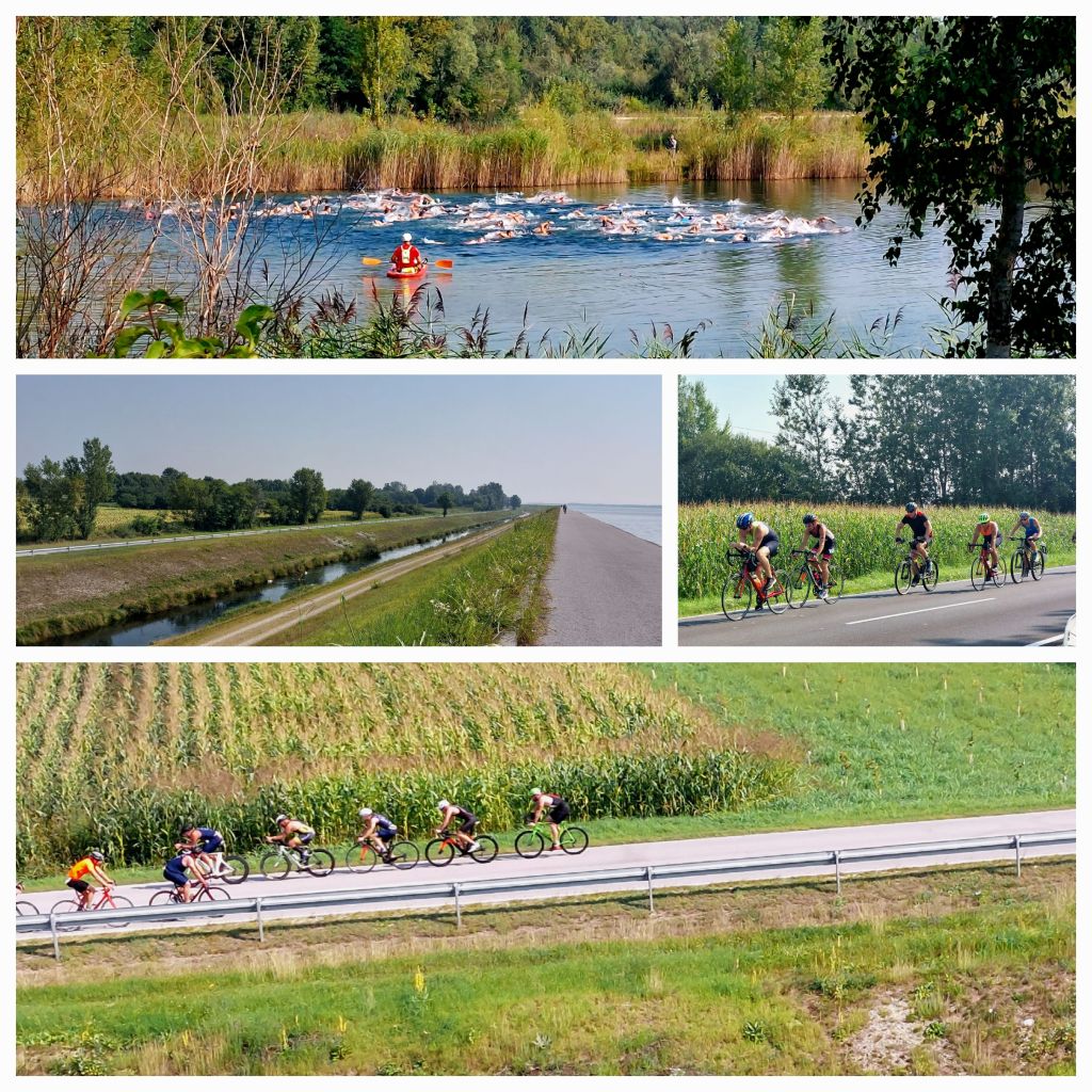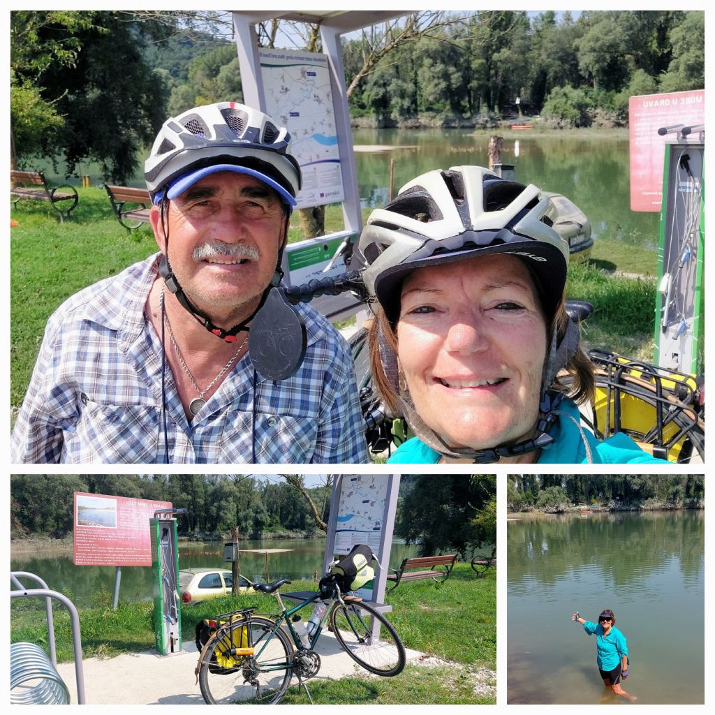 And not to forget the ride today through little villages, corn and lots of spent sunflower crops, how pretty it would have been some weeks ago when the sunflowers would have been at their prime … we all like green and gold! Getting tired of the farming route, we take a route nearer to the river, along a levy on the banks Jezero Dubrava; a reservoir on the Drau, a nice alternative … we see and hear the starting gun of the Prelog Wild Triathlon 2023, swimmers in a small lake, then from our birds eye view on the levy, see the cyclists ride by after their swim, only to join them at the rear as our levy path runs out.