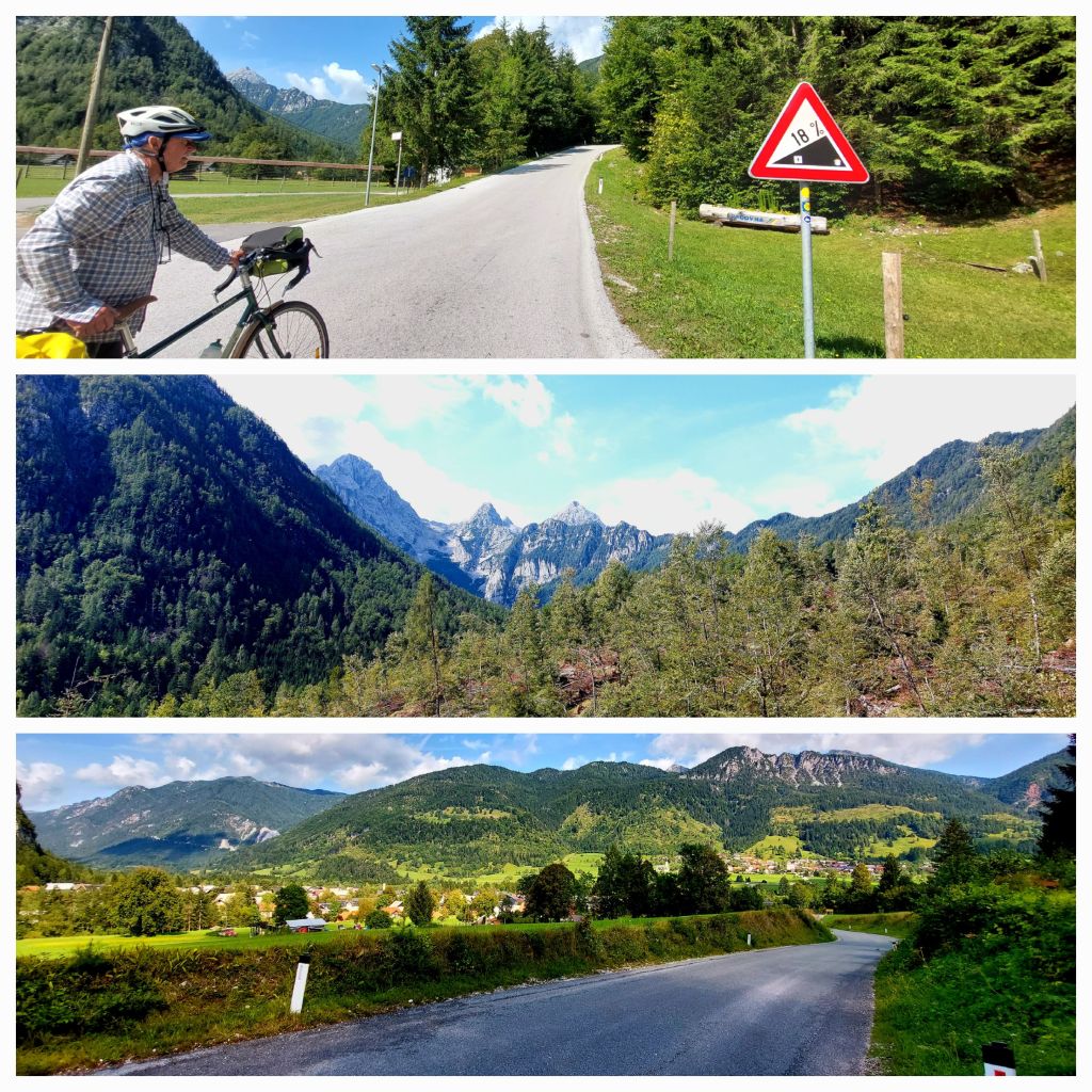 A short sharp hill of 18% before we go downhill into Mojstrana.  It’s looking like Austria, cute houses, mountains, of course, over the mountains it IS Austria.