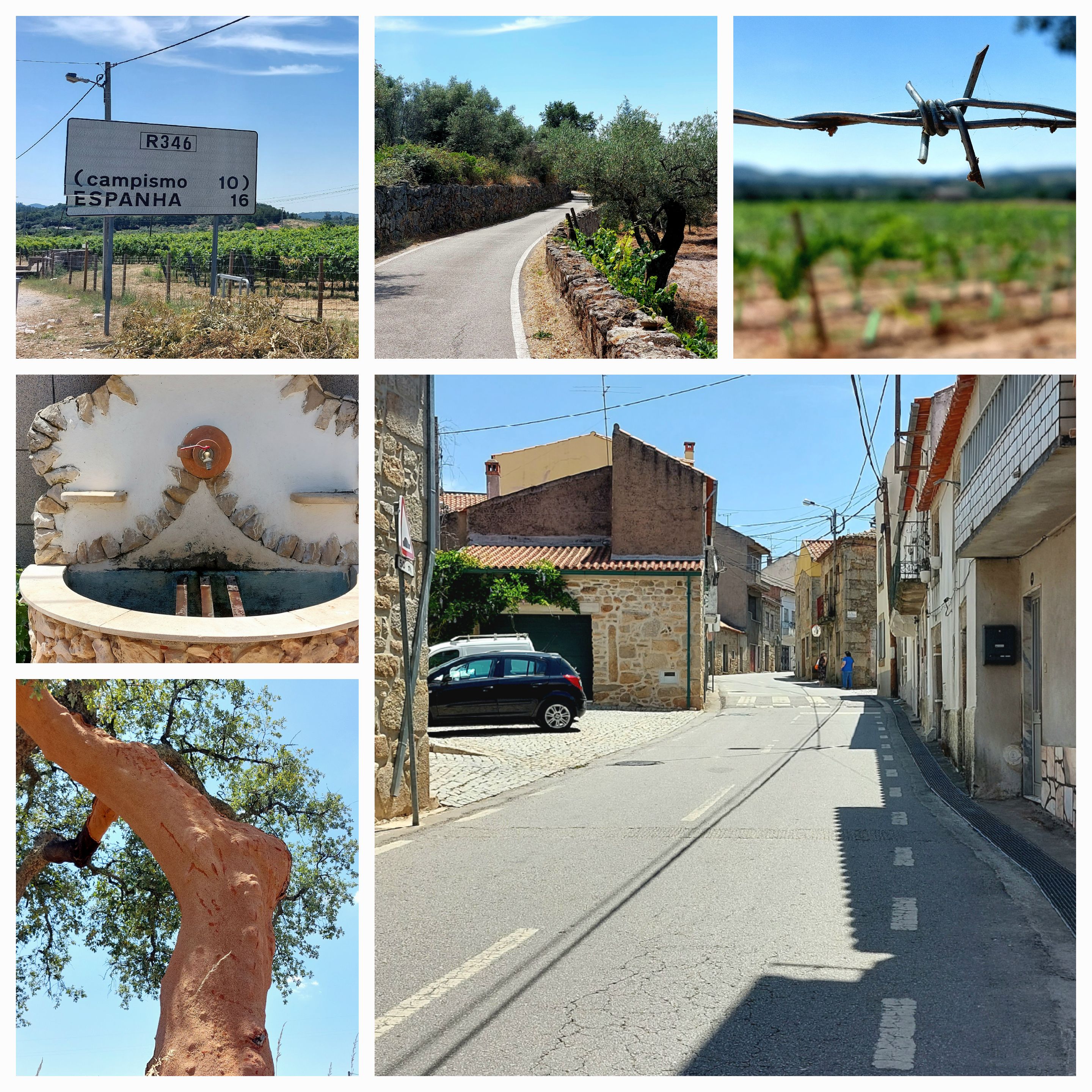 It’s after noon, we are only 16km from the Spanish border, the temperature is topping 41.3C and the hills are getting to 7-10% just outside of Monsanto. The last few kms have to be walked, it’s too hot and too steep to ride, John cussing.