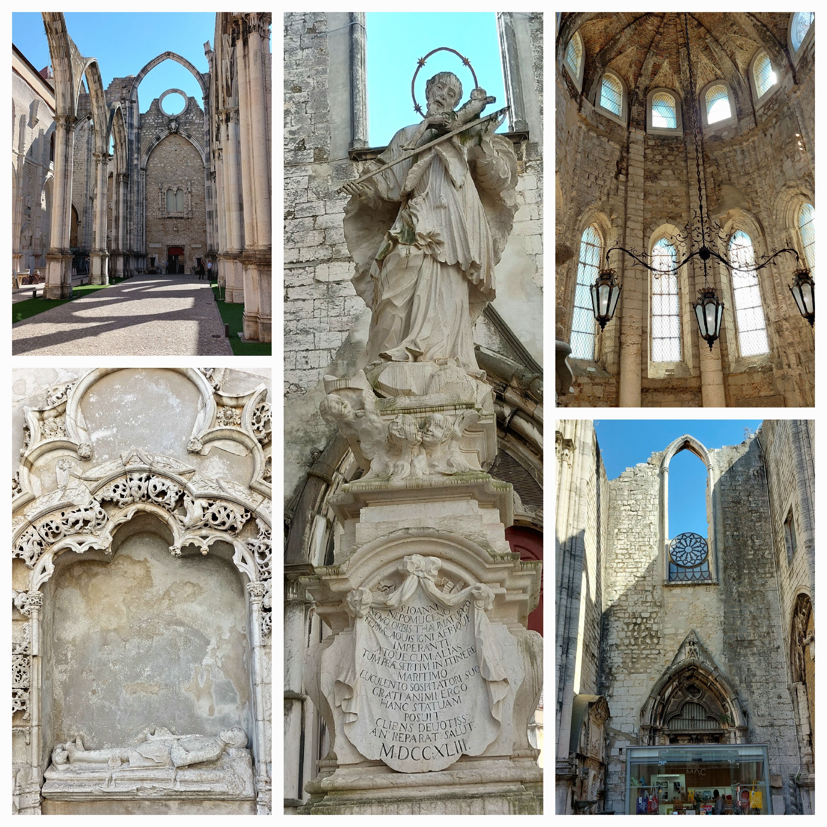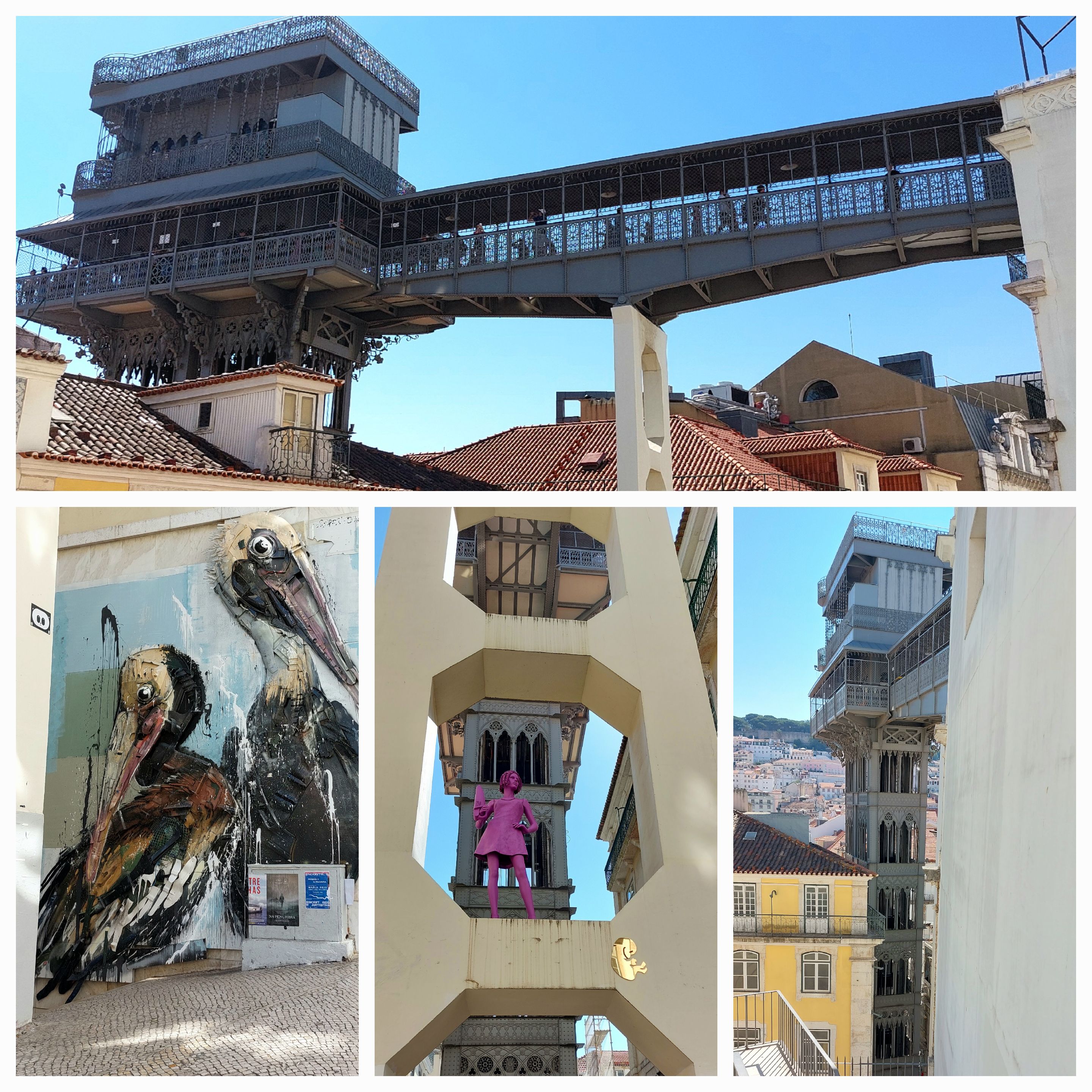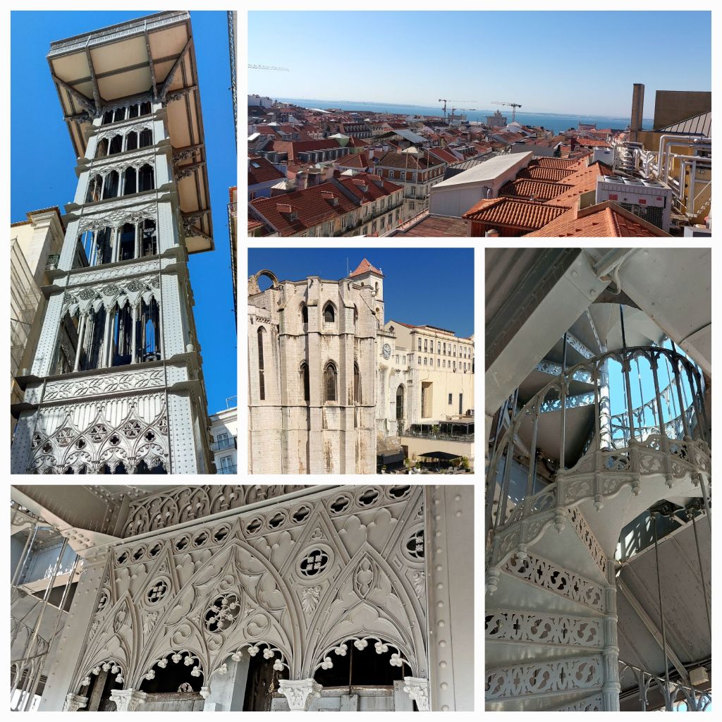 A summer day, beautiful blue skies you get that feeling it’s going to be hot. The Metro was busy as we headed to the centre of town. The aim was go to the Elevator de Santa Justa we were 5th in the queue for the day. The lift goes up 7 floors … 47m; today it is a tourist attraction, however in it’s day was a main thoroughfare for locals to get up the steepest Lisbon.The views were great on the clear day we have, the construction and architecture is another visiting attraction built by an apprentice of Gustav Eiffel (Eiffel’s name has been remembered all throughout Portugal in terms of bridge constructions). On the top level is the ruins of the old Church of the convent of Santa Maria do Carmo and the Archaeological Museum. Lisbon was almost flattened in 1755 by an earthquake which followed by large fires. The remains of the church is now a tourist attraction, the church and museum were well worth the visit. Back down on the street, a walking tour group is just starting … I can hear the guide speaking English … giving the opening blurb … we ask to join … we were going to have breakfast … oh well …