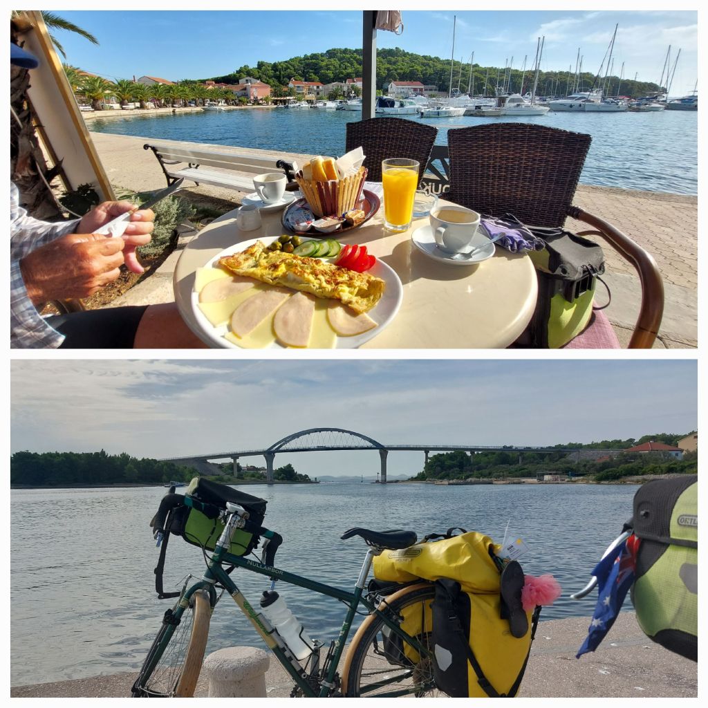 A very short ferry trip back to the mainland … you have to love this travel … onto EV8 no accommodation booked, we pass by Pirovac and decide to go further to Tribunj. Nothing booked, we go to a few zimmers but they are all full. I feel we have the whole village looking for a room for us, offering their wifi. We find an apartment and it takes ages to find it with the help of so many. Eventually apartment found … lovely people to hand over the key lots of chats … they are from Serbia and Slovenia. It appears that this town is full is people from Perth, who have emigrated and come back here on holidays to visit family.